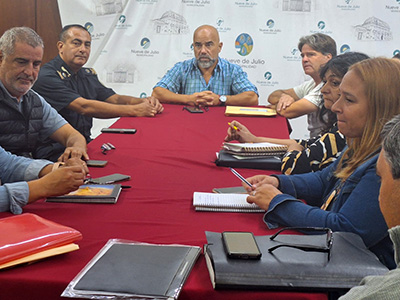 El secretario de Gobierno y Producción de la Municipalidad de Nueve de Julio, Víctor Altare, el subsecretario de Seguridad y Tránsito, Fabián Beltrán; la directora de Delegaciones Municipales, Romina Carballo; el jefe de la Policía Comunal, Gustavo Quemehuencho y el titular de la Estación Policial local, Emanuel Maccarino, compartieron un encuentro con los delegados de las comunidades del interior, a fin de abordar cuestiones atinentes a la seguridad y prevención del delito.