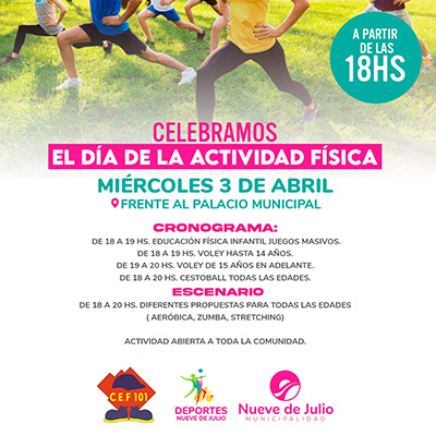 La dirección de Deportes de la Municipalidad de Nueve de Julio y el Centro de Educación Física (CEF) Nº 101, desarrollará el próximo miércoles 3 de abril, desde las 18. y frente al Palacio Municipal, una celebración del Día de la Actividad Física.