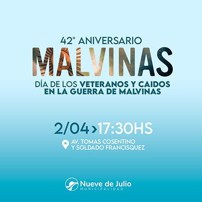 En el 42º aniversario de la guerra y en conmemoración del “Día del Veterano y los Caídos en la Guerra de Malvinas”, la Municipalidad de Nueve de Julio desarrollará los actos oficiales mañana martes 2 de abril, a las 17,30 en avenida Tomás Cosentino y Soldado Francísquez.