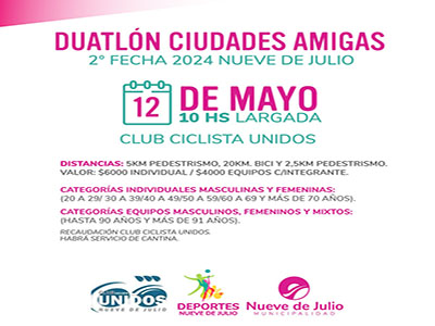 Intentando repetir la exitosa experiencia del año anterior, se llevará adelante una nueva edición del Campeonato de Duatlón “Ciudades amigas”, que tuvo su primera experiencia en 2023 con los distritos de Nueve de Julio y General Viamonte y en este calendario suma a los de Chacabuco y Junín.