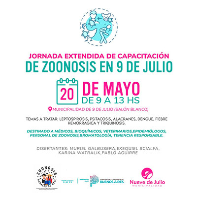 La Municipalidad de Nueve de Julio, a través de la dirección de Bromatología, llevará adelante hoy, lunes 20, una importante Jornada Extendida de Capacitación en Zoonosis, destinada a médicos, bioquímicos, veterinarios, epidemiólogos, personal de zoonosis, bromatología y personas que trabajen en pos de la tenencia responsable de mascotas.