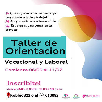 La Municipalidad de Nueve de Julio comunica que se abre la inscripción para el taller de Orientación Vocacional y Laboral; desde el 24/05 al 05/06 en Robbio 322, de 08 a 18 hs., de lunes a viernes, o al teléfono 610082.