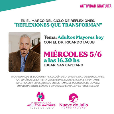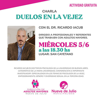 Asimismo, en tanto, a las 18,30 hs., Ricardo Iacub brindará una segunda charla para profesionales y referentes que trabajen con adultos mayores, en el mismo ámbito.