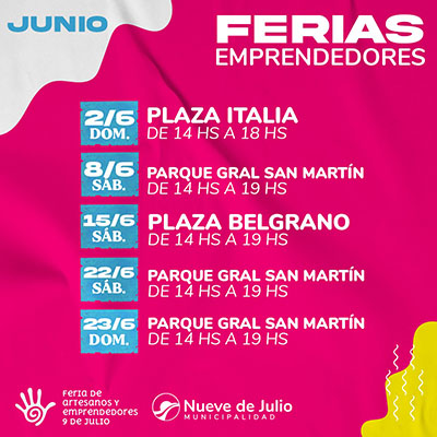La Municipalidad de Nueve de Julio dio a conocer las fechas de las ferias de emprendedores del presente mes de junio, las que serán las siguientes: