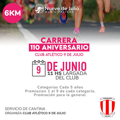 El día domingo 9 de junio, en el marco del programa de carreras urbanas programadas para el presente año desde la dirección de Deportes de la Municipalidad de Nueve de Julio, se llevará adelante la tercera fecha del calendario, organizada por el Club Atlético 9 de Julio, en conmemoración de su 110 aniversario.