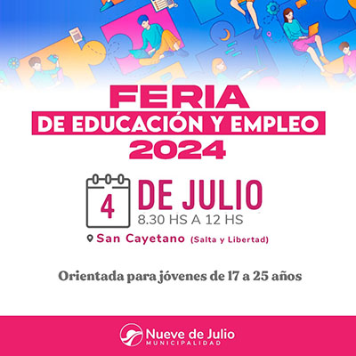 El próximo jueves 4 de julio, la Municipalidad de Nueve de Julio llevará adelante la Feria de Educación y Empleo, organizada por la Oficina de Empleo y la subsecretaría de Cultura, Educación y Deportes, dependientes de la secretaría de Gobierno y Producción, en articulación con la secretaría de Desarrollo Comunitario.