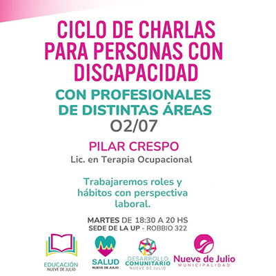 Las secretarías municipales  de Desarrollo Comunitario y Salud y la dirección de Educación, darán continuidad el  martes 2 de julio con el ciclo de charlas para personas con discapacidad, las que estarán a cargo de profesionales de distintas áreas y se dictarán semanalmente todos los martes, a las 18,30  en la la Universidad Popular ( Robbio 322).