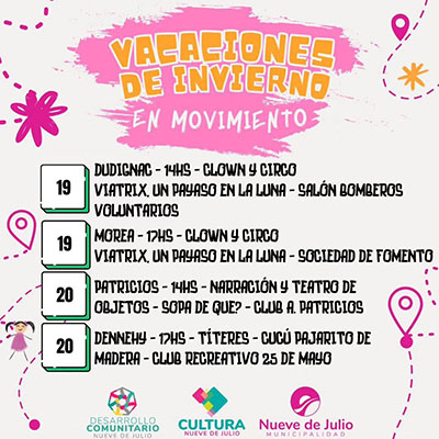 La continuidad del ciclo se dará mañana, viernes 19, a las 14 hs., con clown y circo en la localidad de Dudignac, a través de la puesta en escena de “Un payaso en la Luna”, en el Salón de Bomberos Voluntarios; y a las 17 hs., con el mismo espectáculo, en la Sociedad de Fomento de Morea.