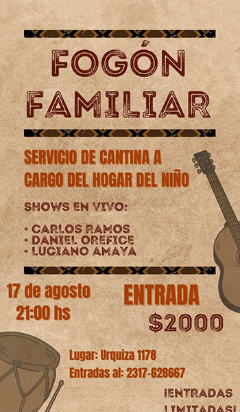 El Hogar del Niño prepara en su sede de Av. Urquiza un gran fogón para el sábado 17 de agosto a las 21 horas.