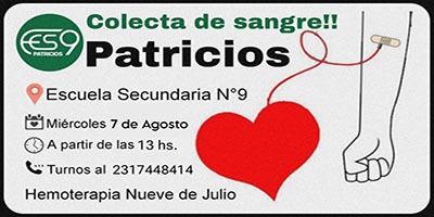 El próximo miércoles 7 de agosto, desde las 13 en la Escuela Secundaria Nº 9 de Patricios se llevará a cabo una importante colecta de sangre, organizada por el Grupo de Hemoterapia de 9 de Julio.