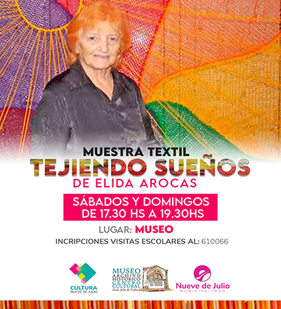 Luego de la exitosa inauguración de la muestra “Tejiendo sueños”, a cargo de la convecina Elida Arocas, el pasado fin de semana, se recuerda que la misma podrá visitarse todos los sábados y domingos del presente mes; entre las 17.30 y las 19.30 hs., en la sede del Museo, Archivo Histórico y Centro Cultural Julio de Vedia.