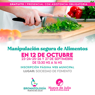 La dirección de Bromatología de la Municipalidad de Nueve de Julio informa que se encuentra abierta la inscripción para el nuevo curso gratuito de manipuladores de alimentos que se dictará entre los días 23 y 27 de septiembre, de 13,30 a 16,00 hs., en la Sociedad de Fomento de la localidad de 12 de Octubre.