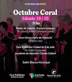 El Coro Polifónico ciudad de 9 de julio y la dirección de Cultura de la Municipalidad de Nueve de Julio invitan a la segunda fecha del tradicional ciclo de conciertos “Octubre coral” el sábado 19 de octubre.