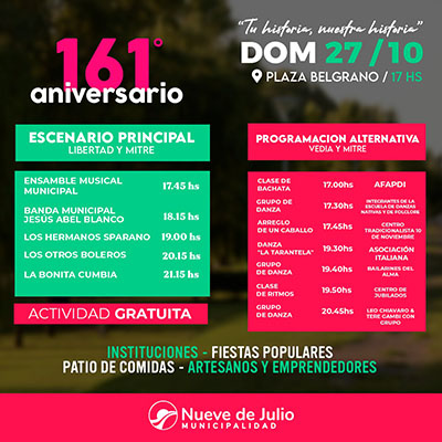 El domingo 27 de octubre se celebrará l 161 aniversario de la fundación de la ciudada. serà en la plaza General Belgrano a partir de las 17.