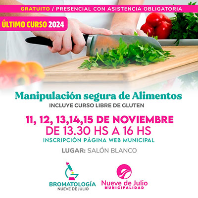 La dirección de Bromatología de la Municipalidad de Nueve de Julio informa que se encuentra abierta la inscripción para el nuevo curso gratuito de manipuladores de alimentos que se dictará entre los 11 y 15 de noviembre, de 13,30 a 16,00 hs., en el Salón Blanco Municipal, de manera presencial, con asistencia obligatoria; e incluyendo el curso libre de gluten.