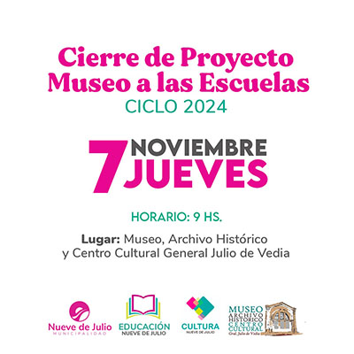 La dirección de Museos y Archivo Histórico de la Municipalidad de Nueve de Julio cerrará hoy jueves 7 a las 9,00 en su sede una nueva edición del ya tradicional ciclo “Museo a las Escuelas”, que se desarrolla anualmente y cuenta con notable participación de escolares de distintos niveles educativos.