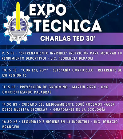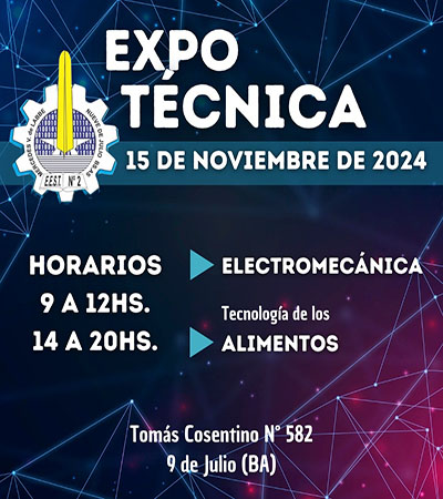 Este viernes 15 de noviembre, la Escuela de Educación Secundaria Técnica Nº 2 “Mercedes Vázquez de Labbé” llevará a cabo una nueva edición de la Expo Técnica. Por la mañana se desarrollará de 9 a 12, concentrando actividades de la modalidad de Electromecánica, mientras que por la tarde la actividad está prevista, desde las 14 y hasta las 20 para lo referente a alimentos en Tomás Cosentino y Tucumán.