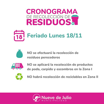 La Municipalidad de Nueve de Julio informa que, ante la conmemoración del Día de la Soberanía Nacional, se han dispuesto modificaciones en el cronograma de recolección de residuos.