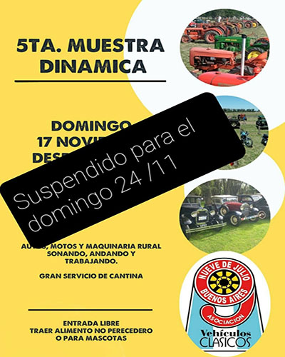 Estaba organizada por la Asociación de Vehículos Clásicos de 9 de Julio  pero ante los ùltimos pronòsticos climáticos, que advierten por una posible lluvia el domingo, la organización que pretendía realizar una mega muestra de maquinarias agrícolas, autos, motos, camiones, motores antiguos, bicicletas y herramientas coleccionables, decidió prorrogar el evento para el domingo 24 de noviembre.