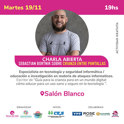 La ONG “Concientizando Palabras”, la Cooperativa Mariano Moreno, la secretaría municipal de Desarrollo Comunitario y la subsecretaría de Niñez, Adolescencia y Familia ofrecen hoy miércoles 20 una charla con la presencia de Sebastián Bortnik, personalidad destacada en el mundo de la tecnología y autor del libro “Guía para la crianza en un mundo digital: cómo educar para un uso sano y seguro de la tecnología”, editado en 2020, quien recorre nuestro país y otros de Latinoamérica brindando charlas y capacitaciones sobre grooming y acoso en redes sociales.