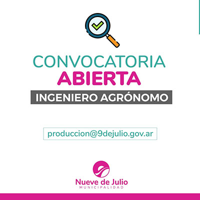 La subsecretaría de Producción de la Municipalidad de Nueve de Julio lanza una convocatoria abierta de Ingeniero Agrónomo para fiscalizar aplicaciones de agroquímicos.