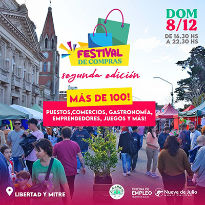 La Cámara de Comercio  y la oficina municipal de Empleo llevaràn adelante el “Segundo Festival de Compras” el domingo 8 de 16,30 a 20,30 en calle Libertad, entre Mitre y San Martín.