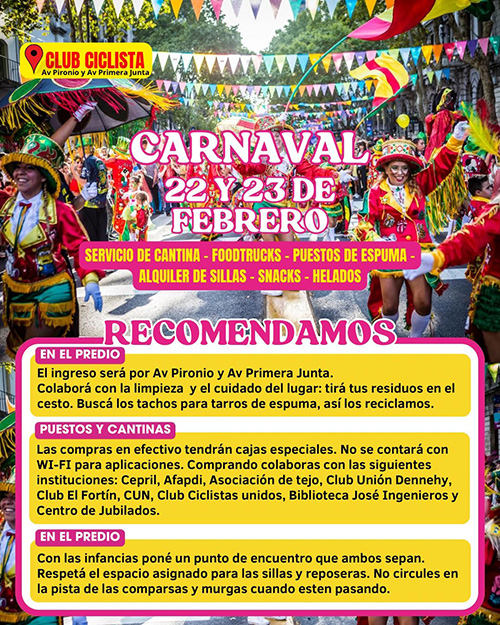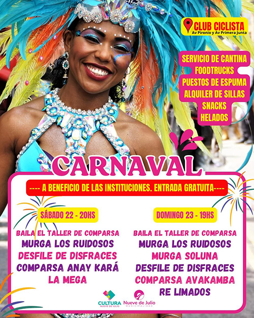 La Municipalidad de Nueve de Julio, a través de la dirección de Cultura, invita a la segunda edición de Carnaval, los días 22 y 23 de febrero, en el predio del Club Ciclista. Con murgas, comparsas y música en vivo, se preparan dos noches a beneficio de instituciones locales que ofrecerán puestos de comida, alquiler de sillas y los tradicionales puestos de espuma.