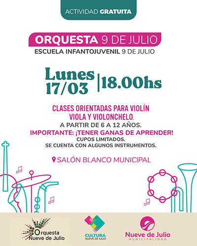 La Orquesta Escuela Infanto Juvenil 9 de Julio, a cargo de Cristian Luzza, contempla un espacio de aprendizaje en violín, viola y violonchello, para niños de 6 a 12 años de edad con ganas de aprender.