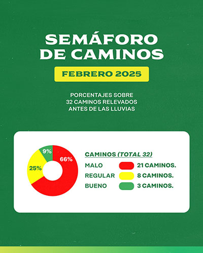 Según se describe del Semáforo, solo el 9% de la red vial monitoreada, está en buen estado (color verde), esto es solo 3 caminos rurales; el 25% en estado regular (color amarillo), estos son 8 caminos, mientras que el 66% de los caminos está en mal estado (color rojo), y se reporta que son 21 los caminos en esta situación.