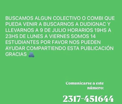 Así lo expresan en un pedido que realizan en las redes sociales y dejan el número telefónico 2317 – 451644 para todas aquellas personas que puedan y estén interesadas en poder trasladarlos.
