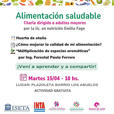 La secretaría de Desarrollo Comunitario de la Municipalidad de Nueve de Julio, a través de la dirección de Adultos Mayores, junto a ISETA e INTA, llevará a cabo una interesante charla sobre alimentación saludable, dirigida a adultos mayores.