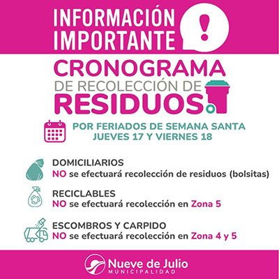 La Municipalidad de Nueve de Julio comunica que, ante los feriados de Jueves y Viernes Santo, NO se efectuará la recolección de residuos domiciliarios (bolsitas), como así tampoco NO se recolectarán productos de carpidos, poda y escombros en las Zonas 4 y 5, respectivamente, para cada una de las jornadas.