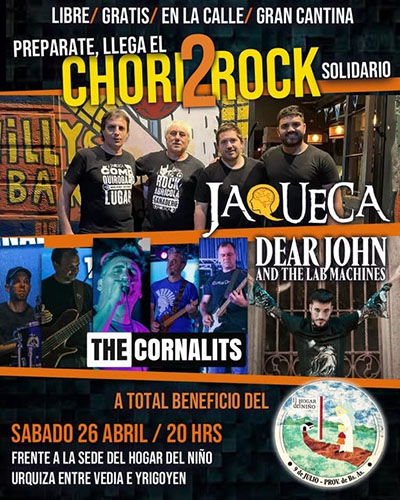 El sábado 26 del corriente se llevará adelante un importante evento solidario para colaborar con El Hogar del Niño, institución de nuestro medio que lleva adelante una positiva tarea comunitaria. Se trata del denominado “2do. Chori Rock Solidario”, que se realizará en esa fecha, desde las 20 hs. en Av. Urquiza e Yrigoyen, frente a la sede de la entidad, contándose con las presentaciones de las bandas locales “The Cornalits”, “Dear Jhon and the lab machinas” y “Jaqueca”; quienes aportarán su arte solidario para este gran evento gratuito, que contará con un completo servicio de cantina, con el que se recaudarán fondos para el Hogar.