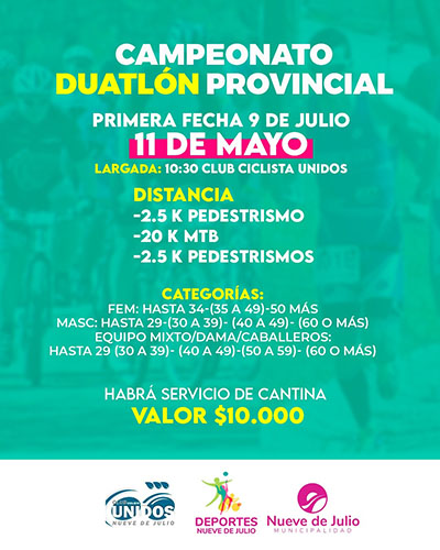 El domingo 11 de mayo, nuestra ciudad será sede la primera fecha del Campeonato Provincial de Duatlón, instancia que se encuentra organizado el Club Ciclista Unidos, con el auspicio de la Municipalidad de Nueve de Julio, a través de la dirección de Deportes.