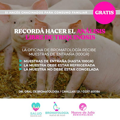 En el marco de la Semana de la Lucha contra la Triquinosis, la Municipalidad de Nueve de Julio, a través de la dirección de Bromatología, lleva adelante una serie de acciones de concientización para prevenir esta enfermedad transmitida por alimentos contaminados, principalmente carne de cerdo mal cocida o sin control sanitario.