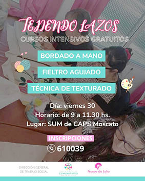El proyecto “Tejiendo Lazos”, llevado a cabo por la dirección de Trabajo Social, dependiente de la secretaría de Desarrollo Comunitario de la Municipalidad de Nueve de Julio, y que tiene como objetivo fomentar la capacidad creativa de las participantes, contribuyendo a su desarrollo tanto personal como laboral, dictará talleres intensivos de bordado a mano, fieltro agujado y técnica de texturado.