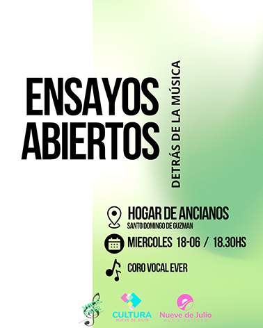 La Municipalidad de Nueve de Julio, a través de la dirección de Cultura, dará continuidad a la segunda etapa del ciclo “Ensayos abiertos”, el miércoles 18 de junio, con la presentación de Coral Ever, dirigido por Kitty Latini, en el Hogar de Ancianos “Santo Domingo de Guzmán”, a las 18.30 hs.