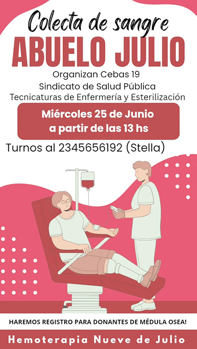 Se realizará el miércoles 25 del corriente, desde las 13 hs., en las instalaciones del Salón Abuelo Julio, conjuntamente con el Servicio de Hemoterapia del Hospital Julio de Vedia, una nueva colecta de sangre, organizada por el CEBAS 19, el Sindicato de Salud Pública y las tecnicaturas de Enfermería y Esterilización.
