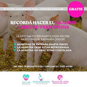 – Si cría cerdos, faena y/o elabora chacinados (chorizos frescos y secos, panceta, bondiola, jamón crudo, etc) para consumo personal, para evitar que usted, su familia y/o sus vecinos contraigan la enfermedad haga analizar una muestra de entraña (100 g) de cada cerdo que faene para descartar Triquinosis. El análisis es sumamente rápido y sencillo.