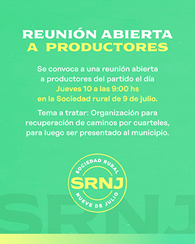 En esta oportunidad se invita a productores rurales de los 14 cuarteles que componen al distrito de 9 de Julio a una reunión abierta con el fin de trabajar una propuesta de organización para la recuperación de caminos rurales por cuarteles, para luego ser presentado al municipio, de allí la necesidad de que los productores puedan acudir y expresarse.