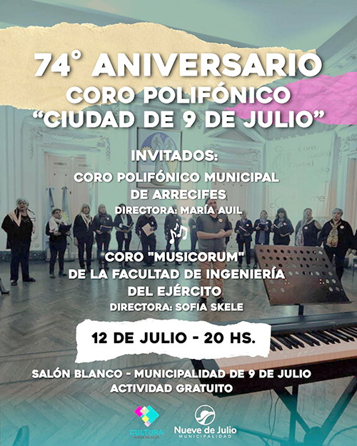 El sábado 12 de julio, a las 21 hs., el Coro Polifónico Ciudad de Nueve de Julio, celebrará su 74º aniversario con un gran concierto en el Salón Blanco Municipal. La agrupación tiene actividad ininterrumpida desde el año 1951, representando a la ciudad en todo el país con su lema “hoy cantamos nosotros, para que mañana lo hagan todos los pueblos de la Patria”.