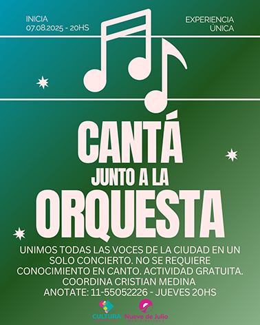 Este proyecto coral comunitario tiene como objetivo reunir las voces de 9 de Julio en dos conciertos especiales que se presentarán junto a la Orquesta Municipal. No se requieren conocimientos previos de canto y está destinado a personas mayores de 15 años.