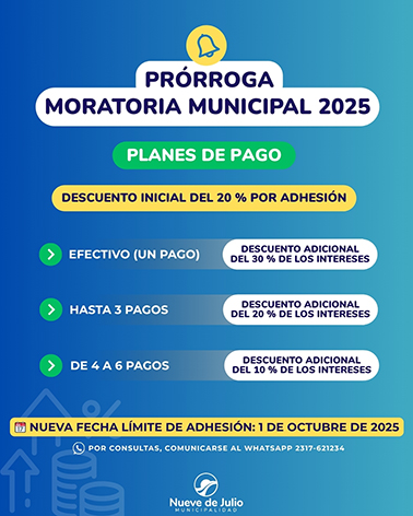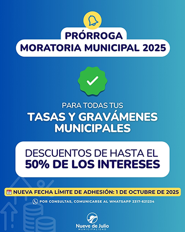 La Municipalidad de Nueve de Julio recuerda que mediante el Decreto N° 1023/2025, firmado el 31 de julio por la Intendente Municipal de 9 de Julio, María José Gentile, se resolvió prorrogar hasta el 1° de octubre de 2025 el plazo para adherirse al Plan de Regularización de Deudas y Tributos Municipales, establecido por Ordenanza 7397/2025.