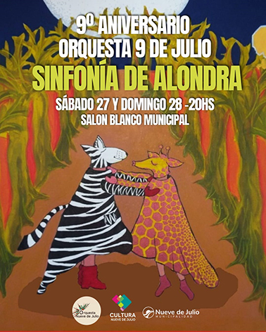 La Orquesta “9 de Julio” celebrará su 9° aniversario con el estreno del espectáculo “Sinfonía de Alondra”, una propuesta innovadora que rinde homenaje a la artista plástica local Graciela Gómez Sala. El evento, dirigido por Cristian Luzza, se presentará el sábado 27 y domingo 28 de septiembre, a las 20:00 horas, en el Salón Blanco Municipal.