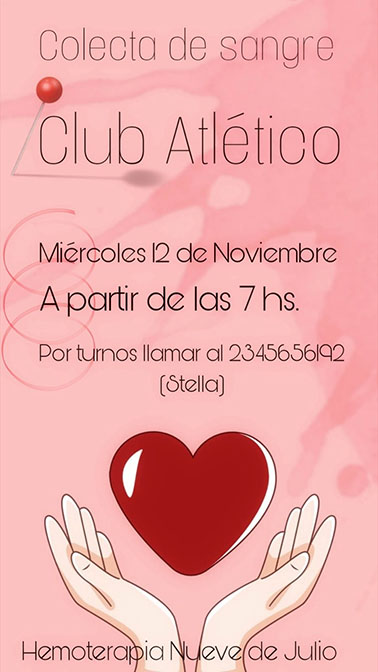 El servicio de Hemoterapia del Hospital Zonal de Nueve de Julio realizará una nueva colecta externa de sangre el próximo miércoles 12 de noviembre, a partir de las 7:00 horas, en las instalaciones del Club Atlético.