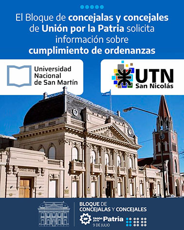 El Bloque de concejales de Unión por la Patria mediante un Pedido de Informe, solicita información sobre el cumplimiento las ordenanzas municipales, específicamente sobre la sanción de la Ordenanza, que ratificó Convenio Marco de Cooperación Técnico Institucional, en materia de Tránsito y Movilidad Urbana, entre nuestro municipio y la Universidad Tecnológica Nacional Regional San Nicolás, con vigencia por cuatro años.