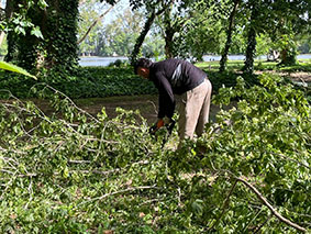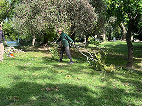 El equipo de la Secretaría de Obras y Servicios Públicos, a través del área de Espacios Verdes, sigue con las tareas en diferentes puntos de la ciudad, llevando adelante el levantamiento de ramas, la remoción de árboles caidos y la limpieza general. También se desarrollan trabajos intensivos en el Parque General San Martín, uno de los sectores más impactados por el temporal.