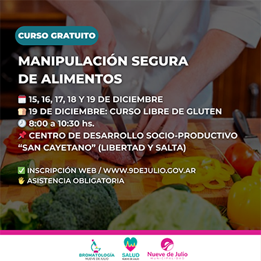 La Dirección de Bromatología, dependiente de la Secretaría de Salud de la Municipalidad de Nueve de Julio, informa a la comunidad sobre la realización de un nuevo curso de Manipulación Segura de Alimentos, que se llevará a cabo en el Centro de Desarrollo Socio-Productivo “San Cayetano” (ubicado en Libertad y Salta).