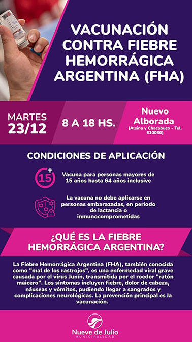 La Municipalidad de Nueve de Julio informa que el martes 23 de diciembre se aplicará la vacuna contra la Fiebre Hemorrágica Argentina (FHA) en el Centro de Atención Primaria de la Salud (CAPS) “Nuevo Alborada” de Alsina y Chacabuco, entre las 8 y 18 hs.