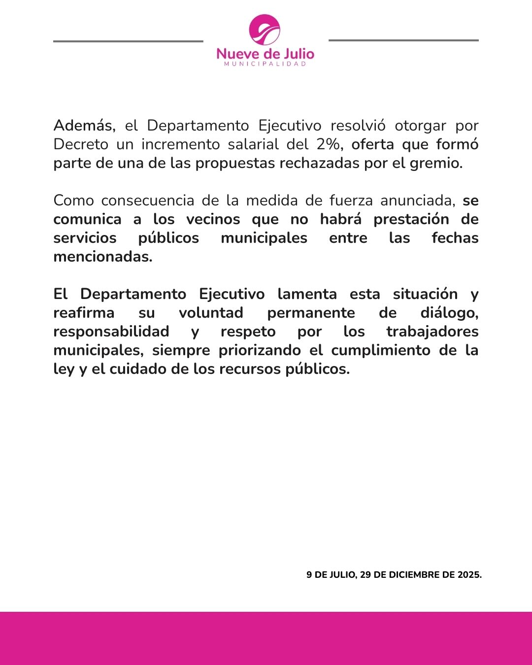 Así lo confirmó la municipalidad de 9 de julio a través de un comunicado que lo difundió en sus redes sociales que publicamos aquí.